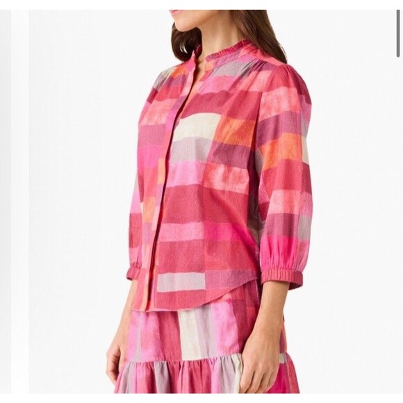 The Nic + Zoe Sunset Plaid Cotton Girlfriend Shirt in colorful medium is a versatile and stylish top perfect for various occasions such as travel, casual outings, or workwear. Made of comfortable cotton material, this blouse features a high neck, 3/4 sleeves, and a button closure. The multicolor plaid pattern adds a fun and vibrant touch, making it a classic and designer piece that can be worn in all seasons. With a regular fit and a basic style, this shirt is a must-have for any woman's wardrobe.