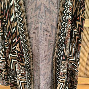Nic + Zoe black and brown sweater in Aztec tribal print with orange and blue accents for Boho Chic look. Open 36" tunic length has long sleeves with distinctive pattern. Looks good with leggings, dress pants or skinny jeans. In cotton and rayon for easy care in size M. No snags or picks. In excellent condition. Smoke and pet free home.