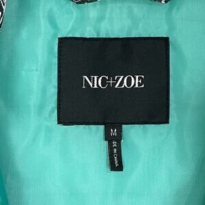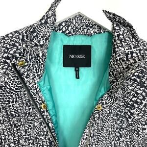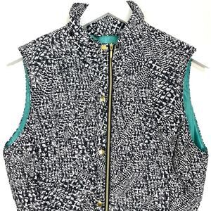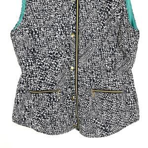 Quilted vest in black and white print. Front zip and snap detail. Zippered pockets.