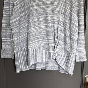 Beautiful and cozy Nic+Zoe Vital Twist Sweater in "blue mix" in women's plus size XXL (2XL). This moderately lightweight knit top features a knotted detail along the ribbed trim at the bottom. This Nic and Zoe sweater is long sleeved with a curved V-neck. The colors are light blue, white and light gray. The blue stands out a little more in real life than in the photos (it's pretty!).