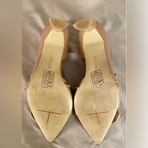 Gently used beautiful striking bow detail the pointy-toe of a half d'Orsay pump elevated by a slim architectural heel. Color is a deep blush in size 8 M