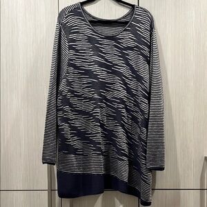 Gorgeous zebra-patterned knit in soft blue and grey. Textured feel with a luxe weight. No size tag, but fits like a 3X (see photos for measurements). Soft viscose blend. One tiny pull on sleeve—barely noticeable.