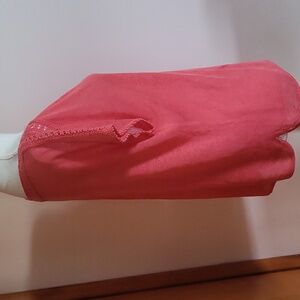 Short dolman sleeve boatneck linen blend top in coral pink color with crochet trim on yoke and sleeves. Boxy fit, semi sheer knit. VGUC! Linen viscose blend. Hand wash. Size medium. Pit to pit 21.5", length 23".