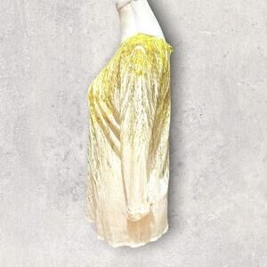 DETAILS: Lightweight Printed Linen Blend top with cuffed 3/4 sleeves. Flaxen brown and yellow pattern blends to cream.