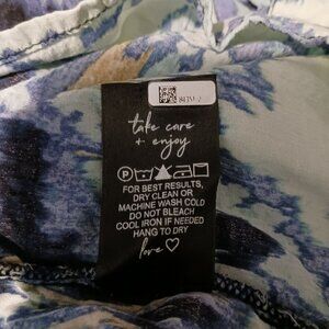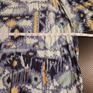 Keywords: Nic Zoe blouse, V neck top, short sleeves, multicolored blouse, size L, women's blouse, abstract print, lightweight fabric, casual top, summer wear, layering top, western blouse, cowgirl top, comfortable blouse, blue and yellow, chic design, fashion top