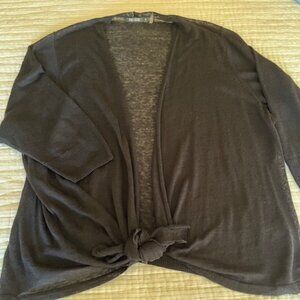 Beautiful lightweight sweater with tie at front, 3/4 sleeves with banded ribbing at sleeves and back. 60% linen, 40% viscose (25-inch length, 27-inch armpit-to-armpit, 19-inch sleeve length from shoulder)