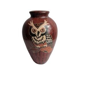 Nicaraguan Pottery OWL Vase Calera Signed Rust Brown Colorful 8"