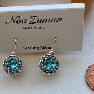Gorgeous Noa Zuman sterling silver 925 dangle earrings with blue quartz. Brand new. Made in Israel. Total length (dangling part): 1"; width: 11mm. Stone diameter 9mm. All approximate. Locking hook closure. Very secure. Elegant and stylish. Substantial, not flimsy earrings. Nice gift.