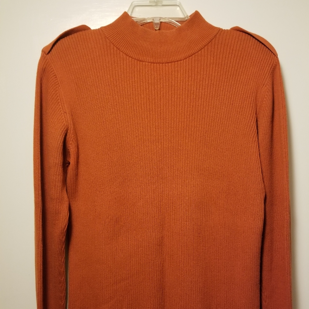 Gently Used Long Sleeved Burnt Orange Mock Neck Sweater with Buttoned Shoulder Flaps!! Good Condition