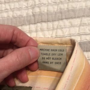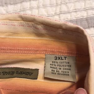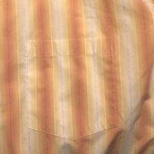 Beyond the Limit men’s casual long sleeve dress shirt. Lightweight. Has 1 pocket in front. Light colors of orange and yellow stripes (very subtle). Great shirt for any spring or summer event.