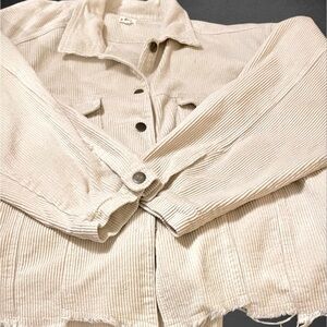 This nice corduroy shacket features a classic collar, loose waist, and a distressed and frayed front hem. Back hem is not frayed. Cropped jacket. A very nice jacket ! Two front chest pockets but no side pockets. Smoke Free Home. No stains.