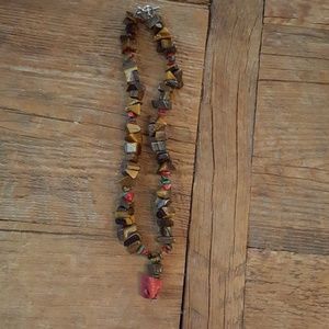 This is a great piece! Nice stones strung on silver wire with silver beads securing the stones to the clasp with a large red turquoise stone being the focal point of the necklace. It is 16" in total length.