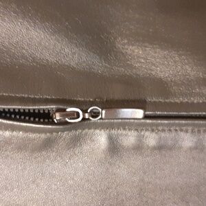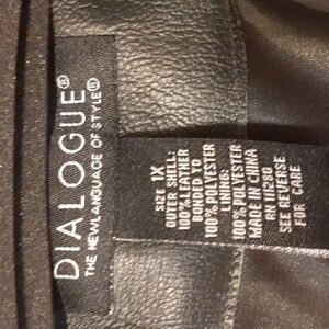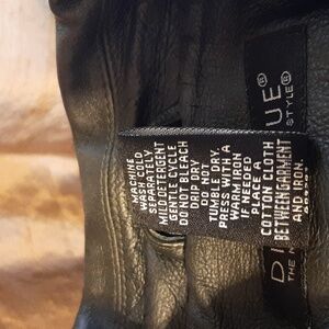 the new language of style. nice black leather jacket. outer shell 100% leather bonded to 100% polyester. satiny feeling lining. no rips. zipper closure. smoke free home. it's machine washable according to the tag! side slit pockets