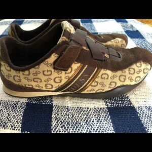 Nice shoes by Guess in size 8. Has velcro streps . They look fairly well from the outside but have damage on the inside heels.