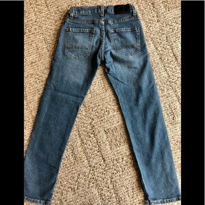 Nice skinny fit Denizen Levi’s 216 jeans in size 10 regular. Is adjustable in the waist with an elastic band . Rise 7.5” and inseam 25”.