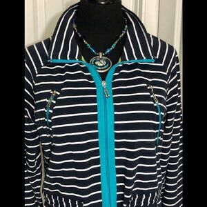 Fun sweater jacket by Onque Sport in size large.Has zippered pockets in front. Measured across from armpit to armpit is 22” and length is 25”.60% cotton and 40% polyester. Gentle used condition.