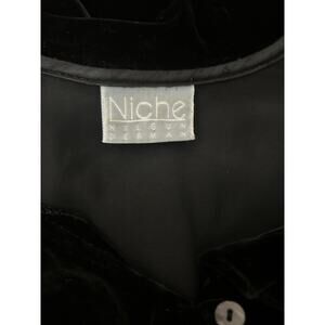 Elevate your style with this stunning black velvet top from Niche Nilgun Derman. The flattering V-neckline and ruffle collar add a touch of romantic gothic charm, while the bell sleeves and lightweight fabric make it a comfortable and versatile choice for any occasion. The solid black color and bohemian-inspired accents create a chic and effortless look that's perfect for the modern woman.