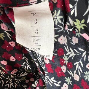 Black and red printed silk (100% Silk). Hourglass. Long sleeves. V-neckline. Wrap with button closure. Lined.