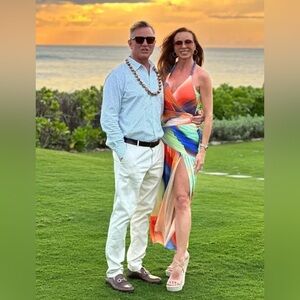 Multicolor abstract crepe (92% Polyester, 8% Spandex). A-line. Sleeveless. V-neck. Side zipper closure. 55" from shoulder to hemline. 31" slit. Imported.