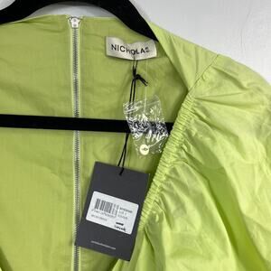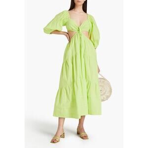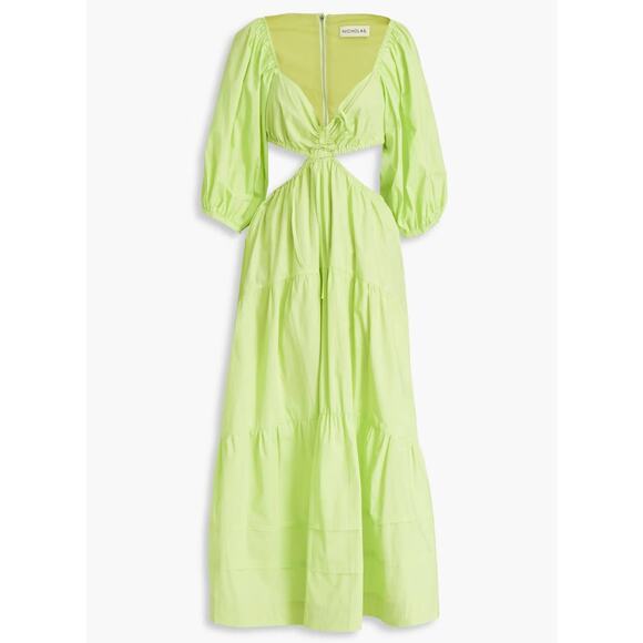 Limeade green cotton Belen cut-out dress from NICHOLAS featuring flared design, cut-out detailing, sweetheart neck, rear tie fastening, rear zip fastening, short puff sleeves and mid-length.