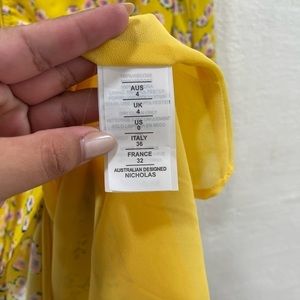 Condition is pre owned. Great condition. No holes or stains. V-neck with front ties. 3/4 length sleeves with elasticized cuffs. Floral print. Mini length. Lined. 100% viscose shell, 100% polyester lining.