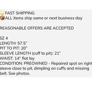 CONDITION: PREOWNED - Repaired spot on right sleeve close to pit, dimpling on cuffs and missing belt. See photos.