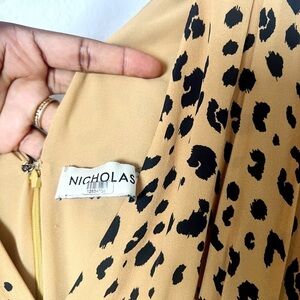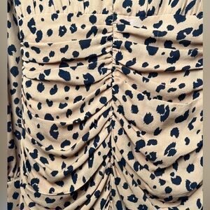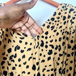 Crepe Non-stretch lightweight fabric Cheetah print Padded shoulders Ruching Ruffle hem Mini-dress cut V neck Long sleeves with button cuffs Hidden zip at back Lined Shell: 100% silk Trim: 100% polyester Lining: 100% polyester