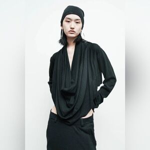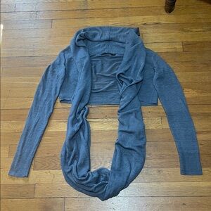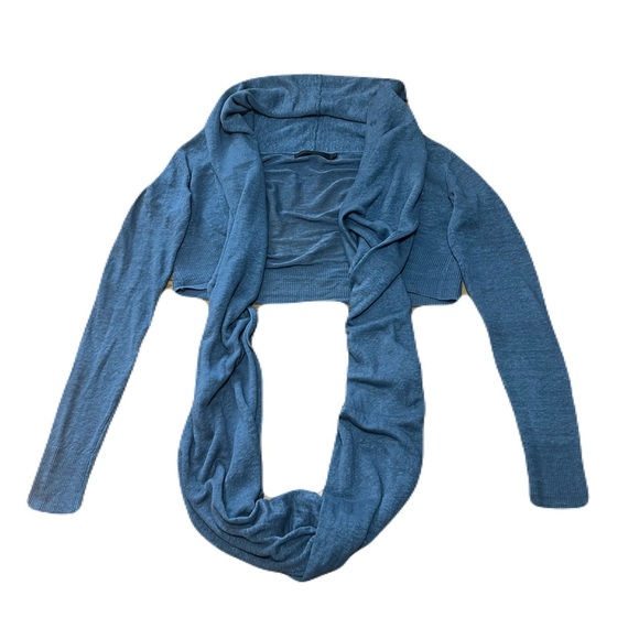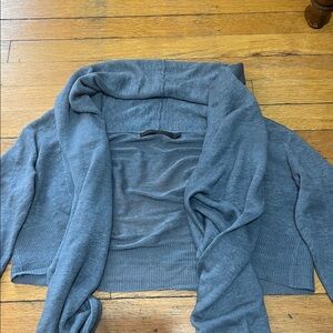 This is a very unique women’s Shelton Crop duster cardigan from the brand Nicholas K. It is a high end, designer Boho brand that colabs with Free People. This garment is in a slate blue/grey color, made of a linen fabric blend, has long sleeves, a built-in shawl style neckline, cropped fit and open front. A great garment for many different occasions!