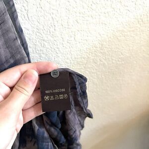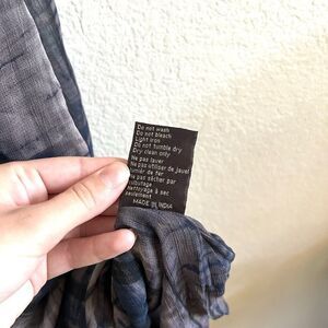 Two layers of gauzy viscose with a dark olive green and dark navy abstract patterning on it.