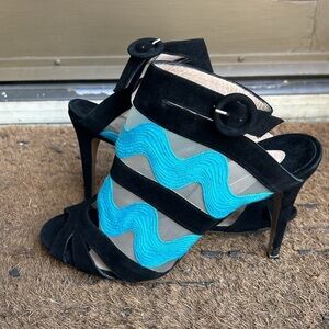 Nicholas Kirkwood Black and Turquoise Mesh Heels High Heel Peep Toe Sandals 40