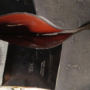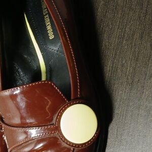 Chic brown patent leather loafers with a stylish gold accent. Perfect for adding elegance to any outfit.