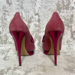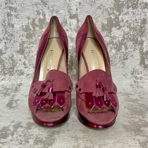 Gorgeous heels from Nicholas Kirkwood! Features stiletto heel wrapped in pink metallic, platform, peep toe style named "Kiltie", pink suede exterior with metallic leather accents, almond toe, and kiltie with tassel details on the vamp.