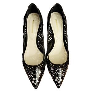 Rare Nicholas Kirkwood Lasercut suede leather pumps. Metallic floral pattern at pointed toe. Geometric cutout sides. Silver metallic triangular block heel.