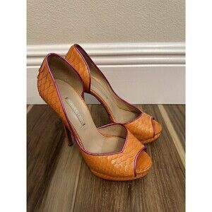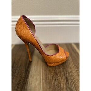 Elevate your shoe game with these stunning Nicholas Kirkwood platform heels. Crafted from genuine leather, the orange snakeskin pattern adds a touch of exotic flair to any outfit. The 6 US / 36.5 EU size is perfect for women looking for a statement shoe that is both stylish and bold. The platform style adds height without sacrificing stability, making these heels perfect for a night out on the town or a day at the office. The vibrant orange hue is sure to turn heads and make a bold statement wherever you go.