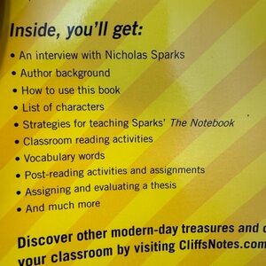 I have four teaching guides for Nicholas Sparks novels, The Notebook and A Walk to Remember. There are two NEW teaching guides one for each novel and two sets of Cliffnotes.