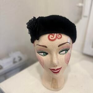 Designer vintage hat mid century mink velvet black cocktail hat beaded floral retro elegance mod chic accessories 50s 60s