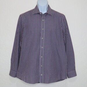Pre-Owned Condition! 60% Cotton/40% Polyester. Handsome Black, Purple & White Plaid Button Down Dress Shirt with White Glossy Buttons(spares attached).