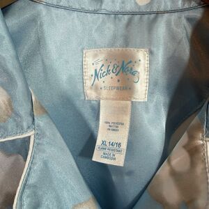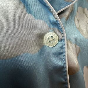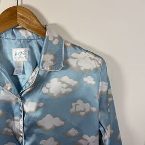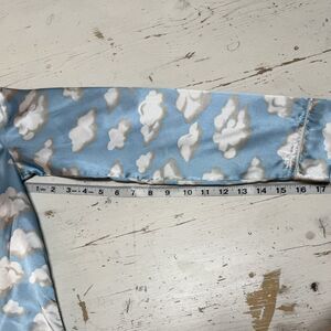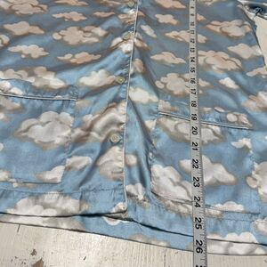 Silky blue pajama top with white cloud pattern. Button-up front. Long sleeves. Comfortable and stylish.
