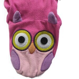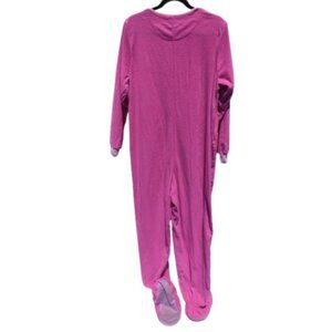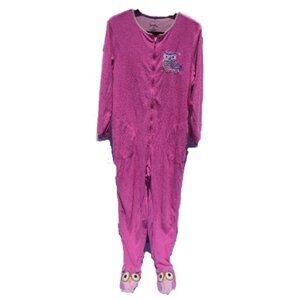 This is a onesie with footsies from the brand Nick & Nora. It says it's a size medium, but it is very oversized and fits more like a large or extra-large. The full body including chest, waist, and hips are 44 inches. The inseam is 29 inches, and from shoulder to crotch is 31 inches. The footsies are 10 inches by 4 inches, which should fit up to a women's shoe size 9. The sleeves are 23 inches long. The onesie is primarily hot pink with light pink and purple accents like an owl on the chest and the top of the footsies. The bottom of the feet have a grippy purple fabric. The onesie has 2 pockets and a zipper along the full body. For material, the body is 100% polyester, and the outsole is 65% polyester and 35% cotton. The onesie is machine washable and dryable. It is in good condition, showing its age like discoloration around the cuffs and the bottom of the feet.