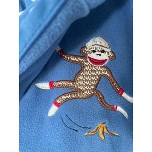 Brand new with tags Nick & Nora Sock Monkey Fleece Hooded Robe. Blue fleece outer with embroidered sock monkey accents and inner sock monkey print lining. 100% polyester. Pockets and waist tie. Toddler size 18 months. Nearly vintage from 2007.