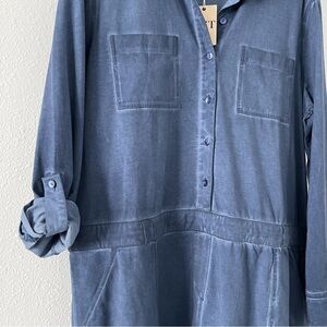 Features: Soft Cotton Blend Very Stretchy Fabric, Washed out Look in Blue, Button Up Top Into Collar, Pockets, Belt Loops, Long Sleeve, Roll Tabs