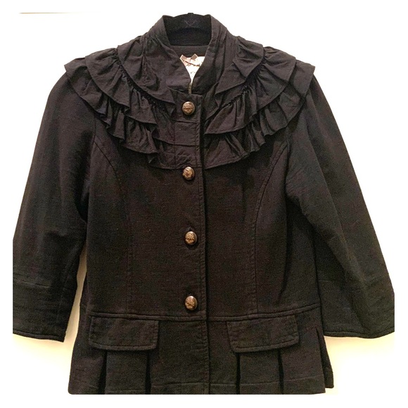 Nick and Mo jacket with ruffling around the neck and also the bottom hem.