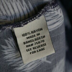 Nickel & Iron blue and white button shirt with palm pattern. Size Large, 100% rayon.