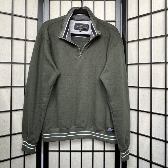 Men's dark green pullover with white and blue details