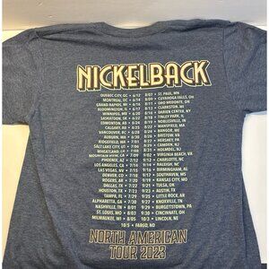 Nickelback 2023 concert T-shirt, soft, material, distressed, looking screen printed shirt tour dates on the back are from June 20 23 to October 2023.