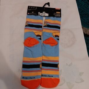 These casual socks showcase a lively light blue background adorned with a playful cartoon character design, likely inspired by the Tweety Bird franchise. The crew-length socks feature bright orange accents on the toe and heel, adding a fun pop of color. Perfect for adding a cheerful touch to your everyday outfit.