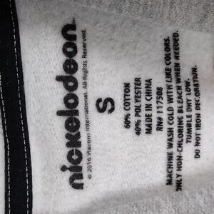 Nickelodeon Women's Multi-Character Cartoon Graphic Gray Long Sleeve Waist Length Pullover Hoodie Sweatshirt. 60% Cotton, 40% Polyester. Double Black Upper Sleeve Detail. Drawstring Hood. Graphic Design Wear. Measurements approx. Flat Lay. Pit to Pit: 19, Sleeve: 25, Length: 25". Size Small. Color May Vary Due To Lighting.