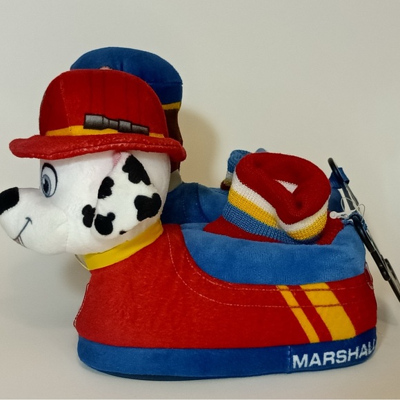 Paw Patrol slippers with light-up feature. Bright blue and red design. Cozy and fun for kids.