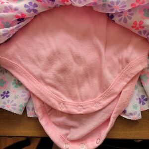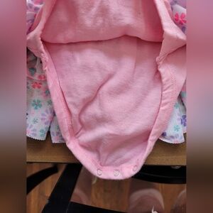 cute dress with a onsie snap bottom, ruffled skirt, and a bow on the front.