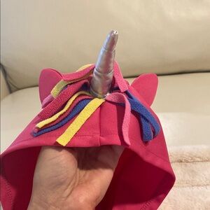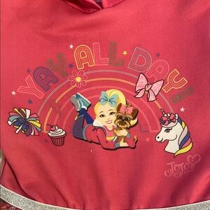 Adorable pink unicorn hooded dress featuring a playful cartoon print. Elastic waistband, two layer full skirt. Features Jo Jo Siwa on chest and slogan Yay All Day. In good condition. Size XS 4/5